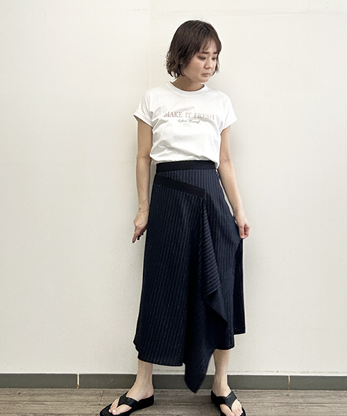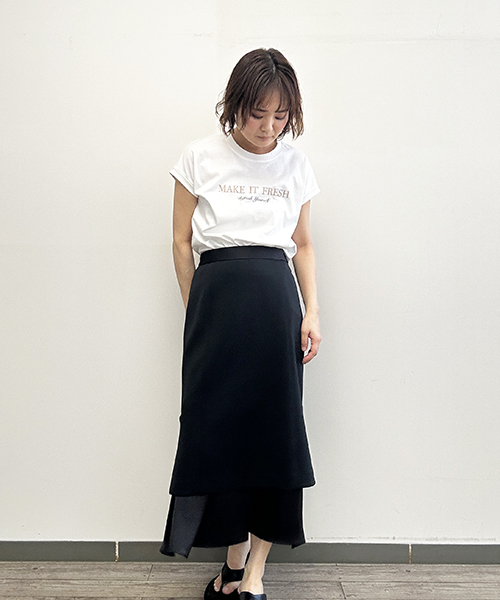 同素材のブラウスとのセットアップコーデはもちろん、お手持ちのシャツやカットソーとのスタイリングもおすすめ。