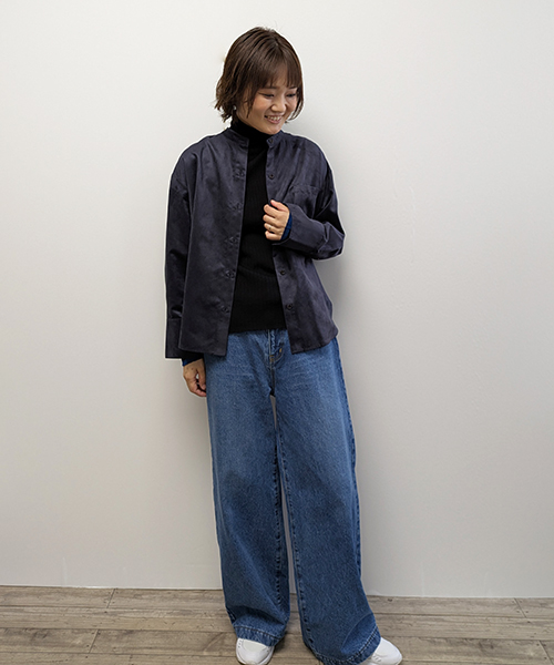 デニムなどカジュアルなボトムと合わせたラフな着こなしがおすすめ。