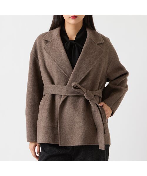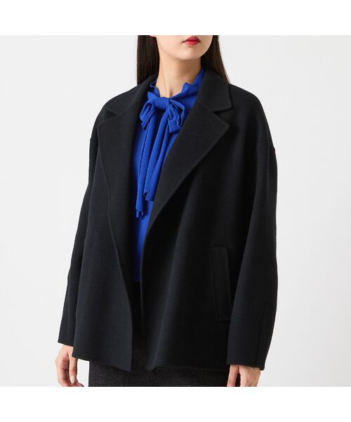 広めに幅を取った襟周りが華やかで女性らしさを感じるショート丈のウールリバーコートです。