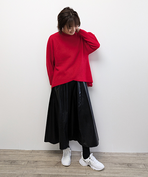 また、あえてボリュームあるワイドパンツやスカートとのコーディネートもモードで大人な雰囲気に決まります。