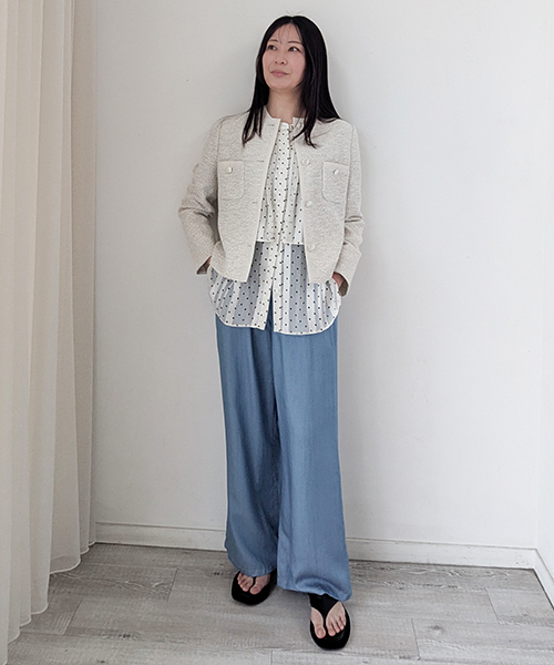 華やかな甘めブラウスで女性らしさをプラスし、大人のきれいめカジュアルに。