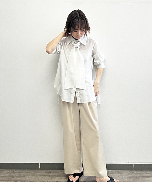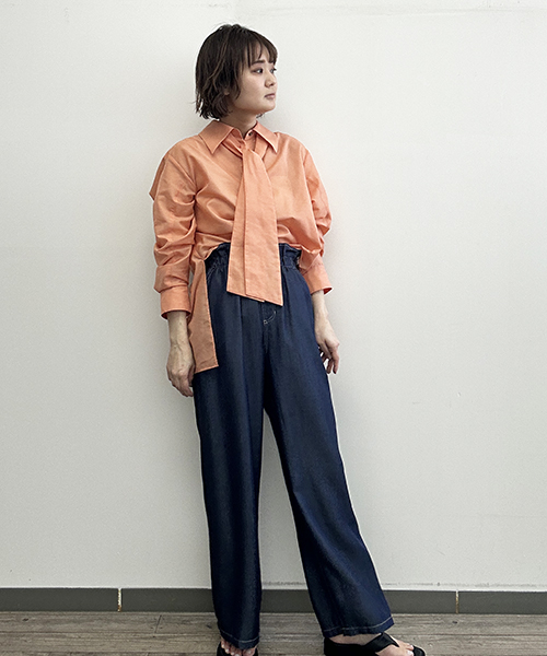 大きめ襟と太めのリボンタイがポイントのシャツブラウスです。