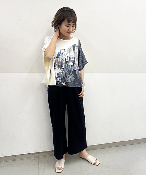 ヨーロッパの景色や建物を描いたアーティスティックな柄で、1枚でコーディネートの主役になります。