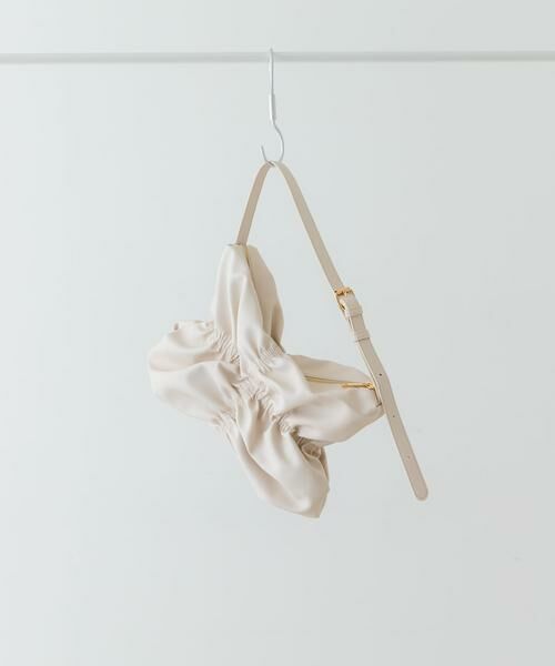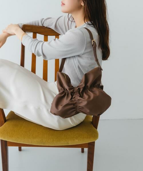 バッグ前面にあしらわれたギャザーデザインが特徴的なショルダーバッグ。合皮にツイル加工を行い、マットな質感に仕上げました。さらに配色にはシックな色調を採用し、デザインバッグながら大人かわいい印象を引き立てます。