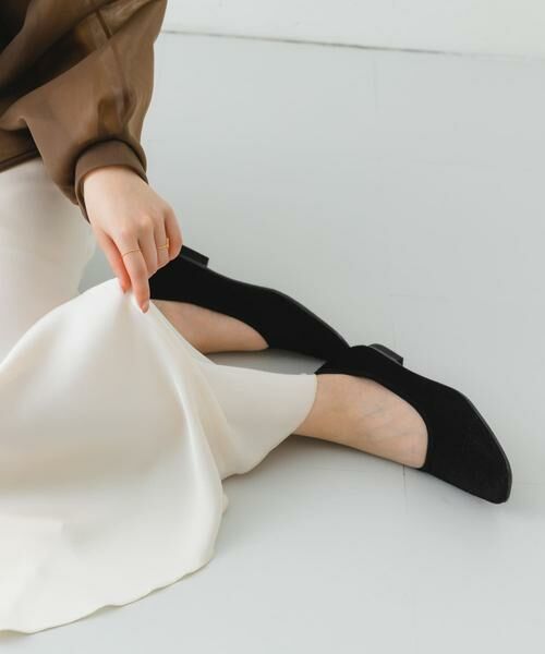 メッシュ生地のベロア素材がポイントのフラットシューズ。