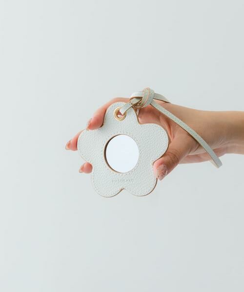 バッグのアクセントになるミラーチャームでレトロなフラワーシェイプが大人可愛い。レザーの長めストラップがポイントでバッグなどに装着いただけます。