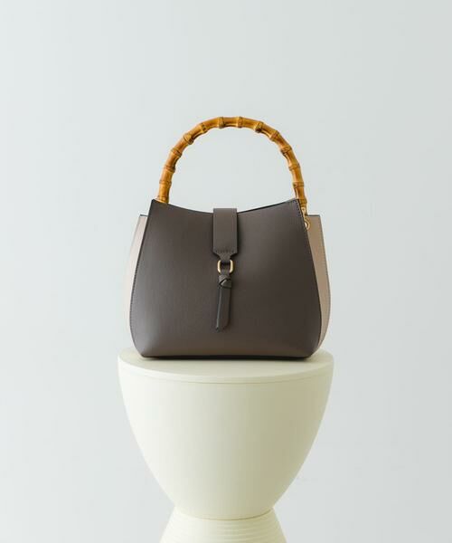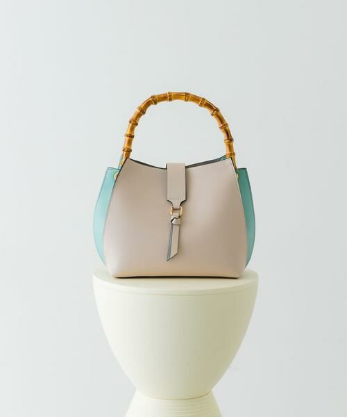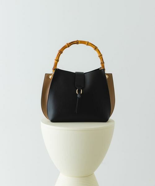 ナチュラルなバンブーの持ち手が高級感をプラスしてくれるハンドバッグ。バイカラー配色が単調にならず、シンプルながらも洗練された印象に。