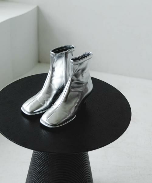 丸みのあるスクエアトゥとキトゥンヒールが特徴のショートブーツ。