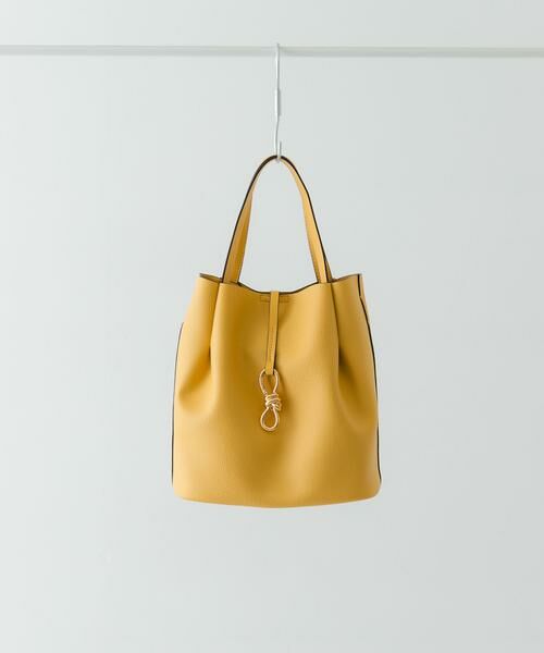 高さがあり、水筒や折り畳み傘なども収納できる縦型バッグ。フェイクレザー素材でありながら、なじみの良いくったりとした生地感が魅力です。フロントのリボンモチーフ金具がアクセントになり、シンプルながらもオシャレな印象。本体は一色で統一され、どんなコーディネートにも合わせやすいデザインです。付属のポーチはショルダーとしても使用可能で、使わないときはバッグ内部に収納可能。2個持ちやポーチ単体での使用もできる便利仕様です。