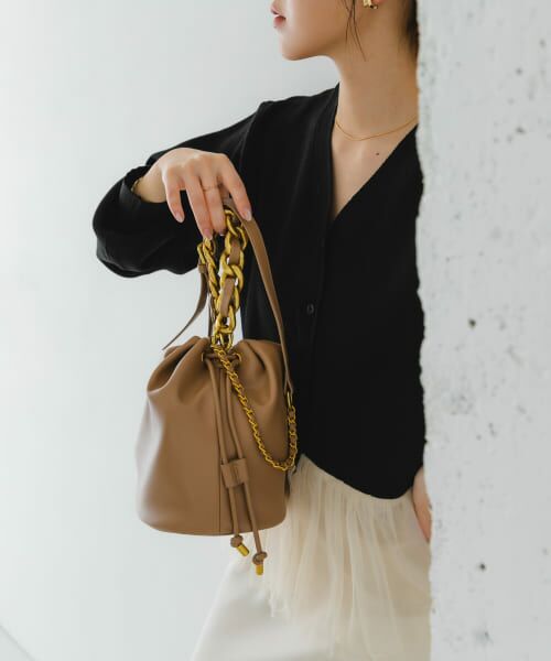 持つだけでアクセントになるデザインバッグ。チェーンが上品な印象にしてくれコーディネートを選ばないデザイン。ハンドル、ショルダーは取り外し可能でお好みに合わせて使い分けいただけます。