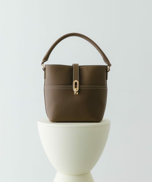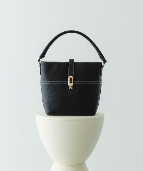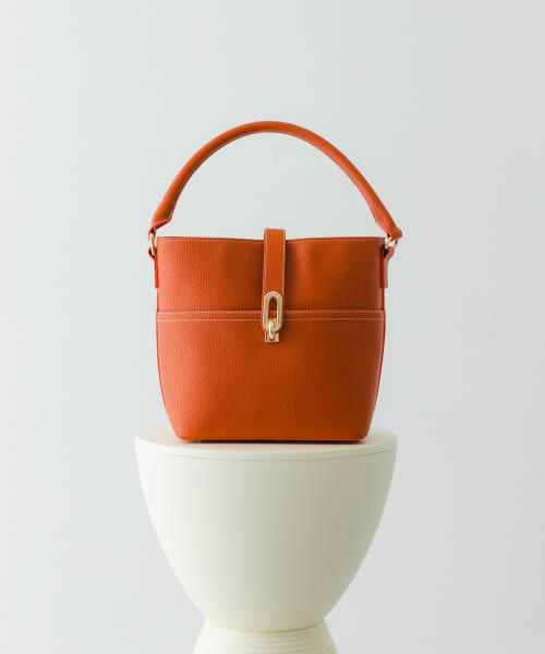 トレンドのワンハンドルデザイン。バケツ型で型崩れがしづらく底鋲付で自立型。フロントにポケットが付いているので荷物の小分けも可能。フロントの金具がアクセント。