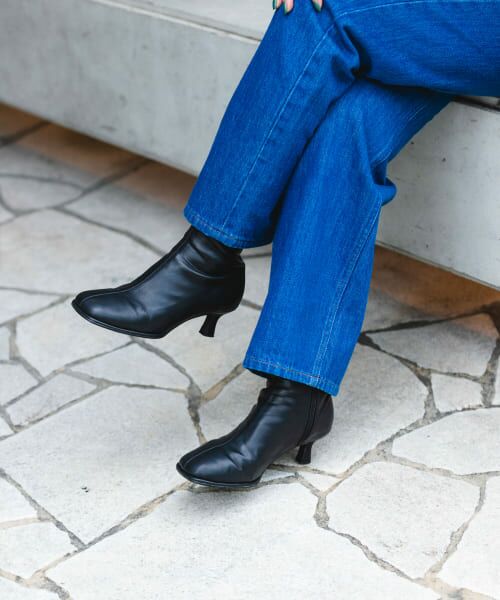 丸みのあるスクエアトゥとキトゥンヒールが特徴のショートブーツ。