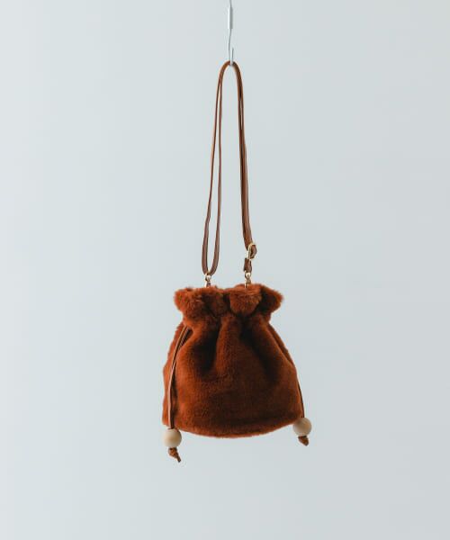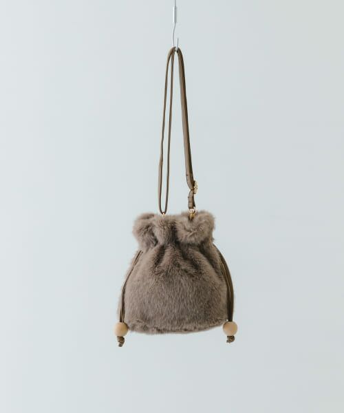 フラッフィー素材×ウッド素材のパーツがアクセントになるバッグ。巾着型バッグで長さ調節が可能なショルダー付きなのでメインバッグには勿論、サブバッグでも活躍するサイズ感。