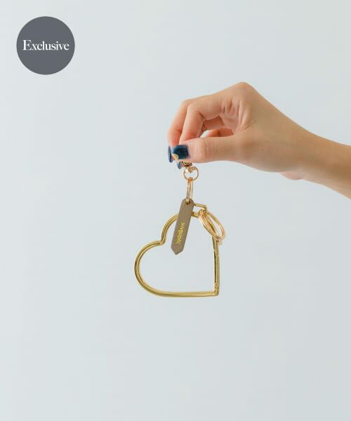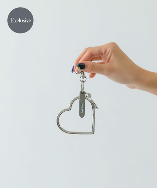 別注デザインのハート型カラビナがポイントのキーチャーム。レザータグが上品な印象。