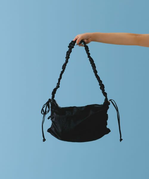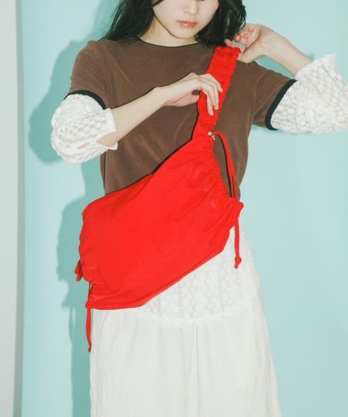 斜め掛けができるショルダーバッグ。サイドにあるドローコードでシルエットの調節が可能で気分に合わせて調節可能。