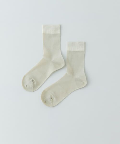 極細ラメ糸を使用したハイゲージソリッドソックスです。シアーな素材感でシーズンレスに人気のあるソックスです。つま先上部の縫い目を足底に持っていきごろつきがないスムースな仕上げになっています。