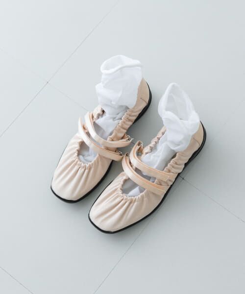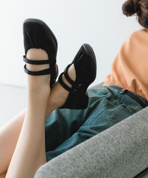 ギャザーデザインが程よく甘さを演出してくれ、ゴム仕様なのでストラップを付けたままでも履けるので着脱がしやすいのも嬉しいポイント。