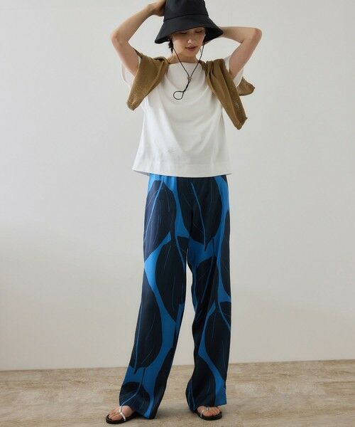 ウエストゴムでイージーな着用感ながら、すっきり見えるシルエットでおつくりしているプリントパンツ。ウエストにコードがはいっていますので、ウエストのサイズ調整できます。きれいめな着用可能で清涼感があり、肌触りがいい素材感。同生地でキャミワンピースの展開あり。