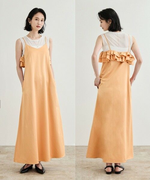 裾にむかってなだらかにフレアーをいれたキャミソールドレス。バック部分にフリルを入れることで、フェミニンなムードを高めます。