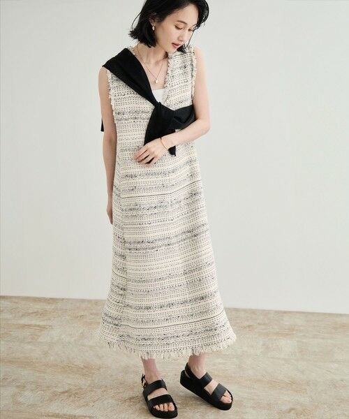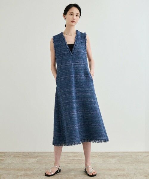 フリンジが華やかなAラインのワンピース。分量感を贅沢にとり、ハリ感をいかしたシルエット。カジュアルにもきれいめにも決まるデザインです。