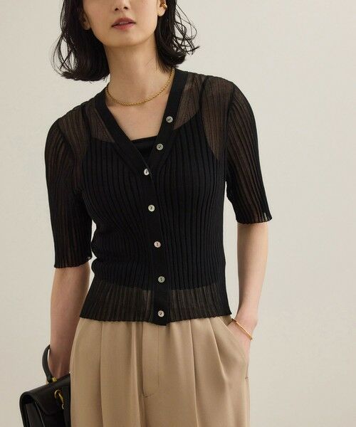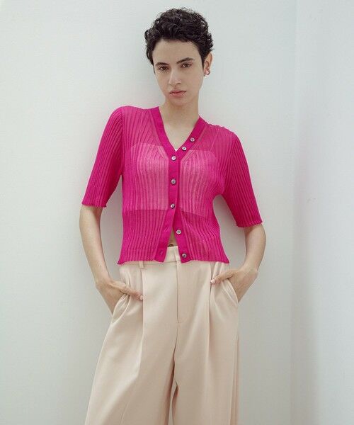 Vネックのコンパクトな五分袖カーディガン。フロントを上まで留めたり、少し開けたラフなアレンジも決まりやすく、羽織だけではないスタイリングを楽しめるアイテムです。上2つの釦はかざりになっています。