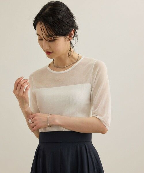 胸元から下の部分を透けないリブで編立ることで、シアーで涼し気な雰囲気がありつつ1枚で着られる安心感のあるトップスです。きれいめなのでオンオフお使いいただけるアイテムです。