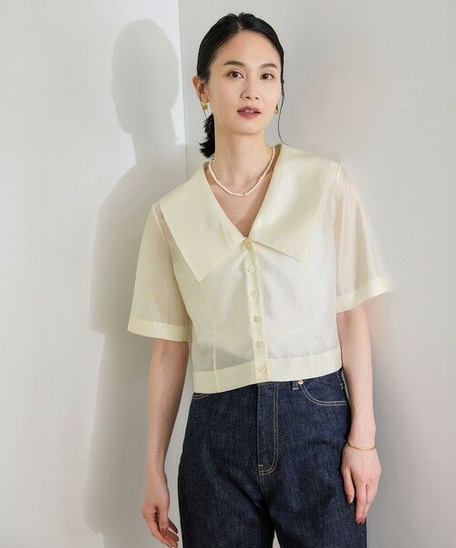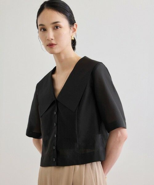襟が大きくデザインされたブラウス。