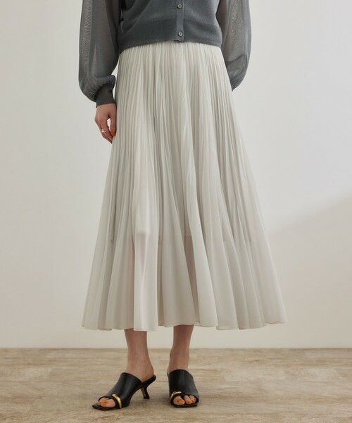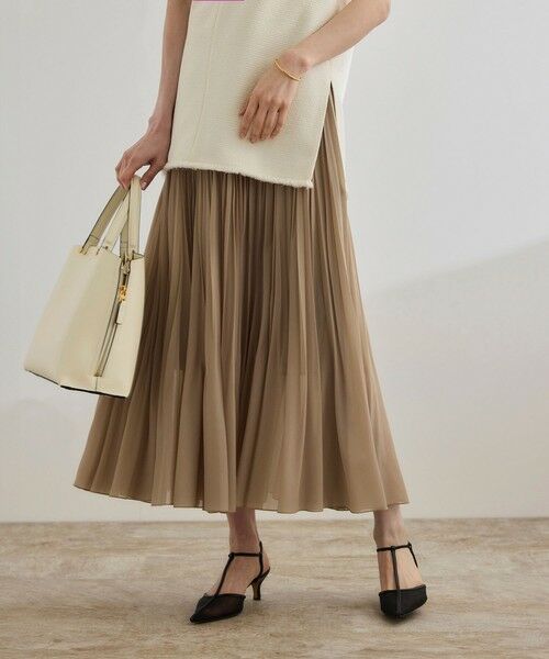 裾にかけてプリーツが消えていく「途中消しプリーツ加工」を採用しており、腰回りのふくらみを視覚的に軽減してくれます。また、ウエストベルト上部分にサテンを挟みこんでおり、トップスをインした時にサテンの艶がおしゃれ度をアップさせてくれます。