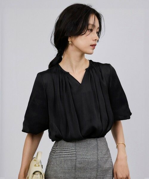 首回りのタックギャザーが華やかなブラウス。インでもアウトでも決まる着丈・サイドスリットなので、前だけタックインも素敵です。波を打つような落ち感でストレスなく着用でき、しっかり二の腕もカバーできます。
