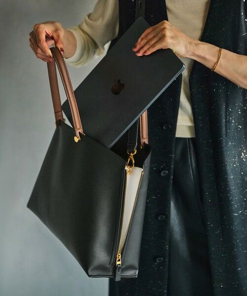 シンプルなたたずまいながら、3分割構造+5つのポケットがある機能的バッグ。サイドジップを開けるとカラーがのぞき、表情がかわります。マチを深くとった容量も魅力。置いた時も自立し、ものの出し入れもしやすいのもポイントです。ショルダーベルトもついており、肩掛け、横かけのできる仕様です。手がふさがりがちな移動シーンに最適です。