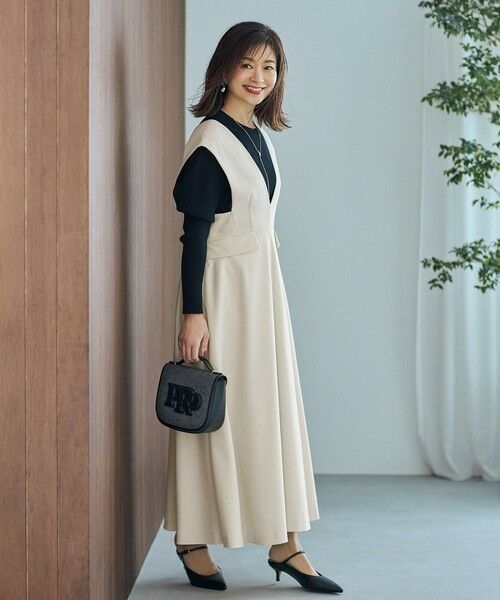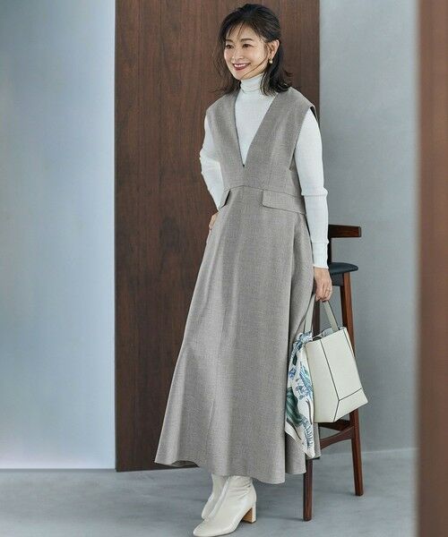 ジャンパースカートは深いVネックでウエストにコルセットをしているようなスリムデザイン。裾に向かって素材をたっぷり使ったフレアーがクラス感を演出してくれます。素材の上品さとボリューム感がワンランク上のマインドに、フラップポケットのデザインがアクセントになりシックな印象に仕上がります。ドラマティックながらミニマルなデザインなので取り入れやすく、一枚着としても、コートインとしてもプラス1アイテムにオススメです。