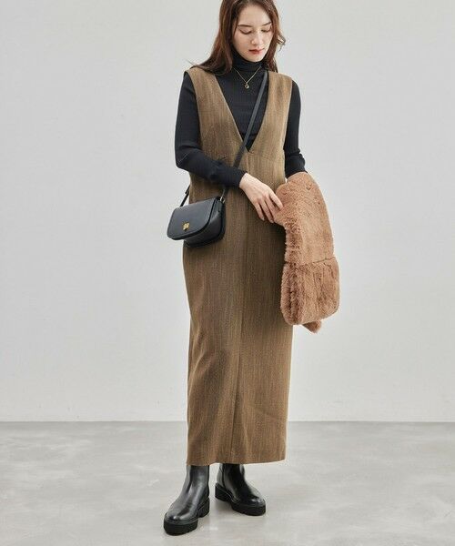 深めにVネックラインで顔回りをすっきりとみせ、ウエストをほのかにマークさせたIラインのジャンパースカートです。素材のマニッシュ感とシルエットの女性らしさがほどよく、ブーツなどの足元にも合わせやすい丈感に仕上げました。