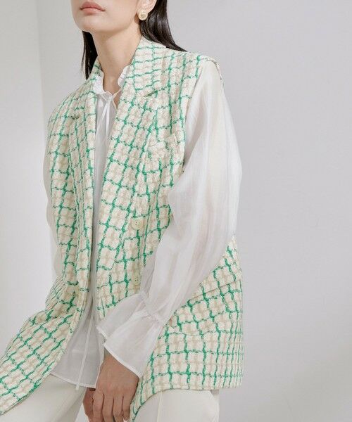 テーラードのダブルブレストデザインのジレは少しだけボクシーなシルエット。本格的なテーラードの雰囲気はそのままにソフトに仕上げているのもポイントです。また、少し長めの丈感がゆったりと抜け感を演出できます。