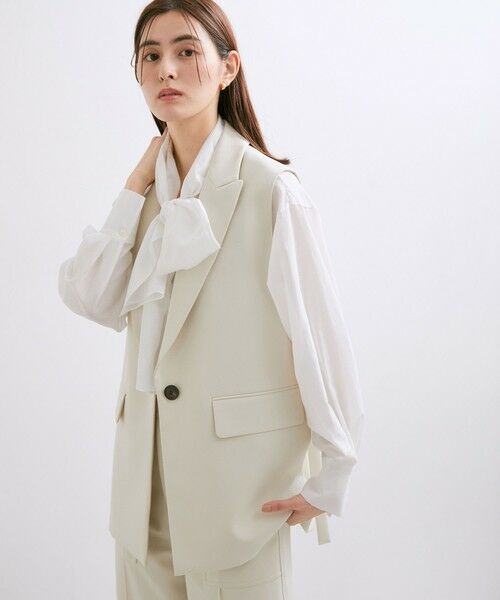 テーラードジレはボクシーなIラインシルエット。肩回りがスッキリときれいに見えるように計算したアームまわりにもこだわりミニマルでシックな印象に仕上げました。軽さを出すため、再度のスリットは大きく開けていて、ウエストについているアジャストのベルトで絞りを調整できる抜け感のあるジレです。