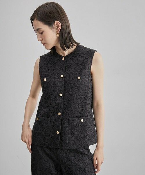 ヴィンテージモダンなベストは繊細なディテールの細コードを衿〜前立て裾まで施し、金ボタンでアクセントを加えたモダンエレガンスなアイテム。シャンタン素材を重ねて仕立てており、一枚着として着てほしいノースリーブアイテムにデザイン。
