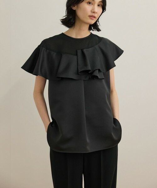 衿周りからデコルテ部分は透けか感素材を使用しサテンラッフルで華やぎを持たせたデザインぶらうすです。ふんわりと仕立てたブラウスです。袖にもギャザーで適度にボリューム感を持たせた大人フェミニンスタイルが叶うブラウスです。