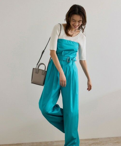 微光沢なサテン素材で仕立てたベアトップオールインワン。