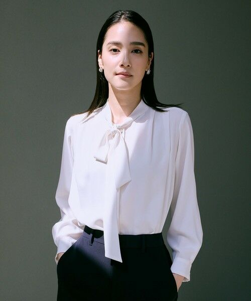 シンプルでスッキリとした印象のボウタイブラウスに、パール釦をアクセントとして加え、フェミニンな要素をプラスしています。