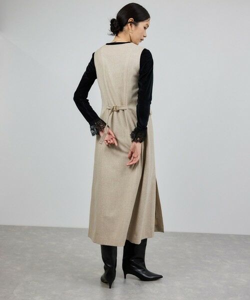 シャープでスッキリ見えする深Vネックと、ウエスト位置のフラップが特徴のツイードジャンパースカートです。ウエストラインを少し高く設定し、脚を視覚的に長く見せてくれるデザインに加え、後ろのウエストベルトでラインをスッキリ見せてくれる効果も期待できます。お手持ちのカットソーやブラウス、ニットの上から着用できるので、気温に合わせたコーディネートを気軽に楽しめるのも嬉しいポイントです。