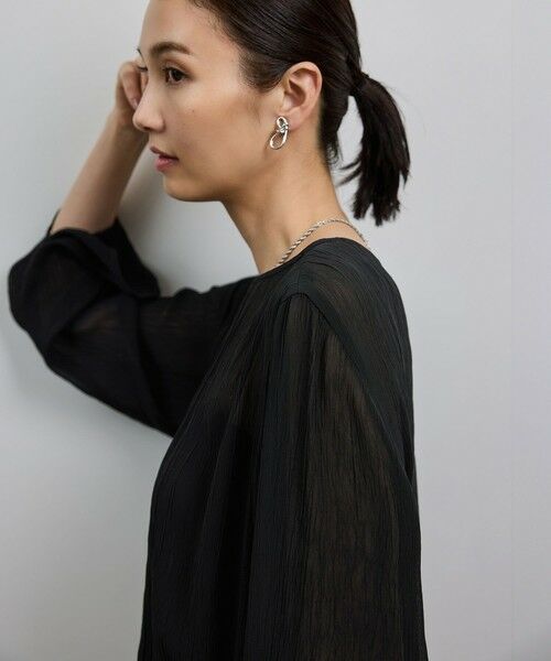 フラットなボートネックと、くるみスナップ釦をあけてヘンリーネックのようなアクセントを付けたネックライン、前後2WAYを楽しめるプルオーバーブラウス。袖口のスリットで上品さをプラス。シアーな楊柳が抜け感と女性らしさを引き立てる、表情豊かなとろみブラウスです。