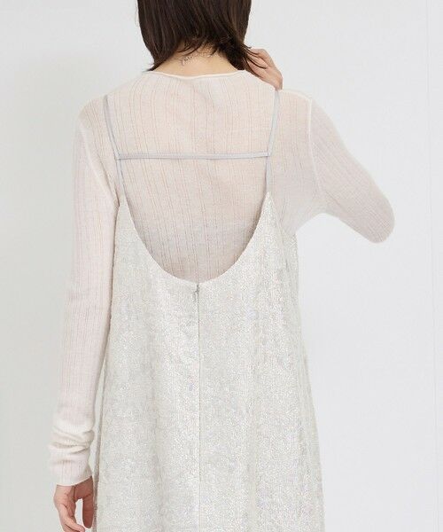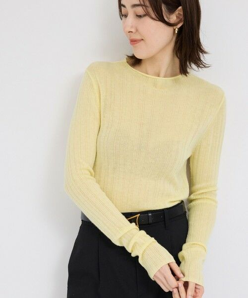 薄手で少しシアーなランダムリブニットはインナーとして便利な一枚です。顔周りをすっきりとみせてくれるビルドネック。