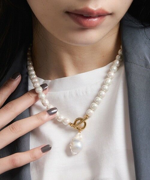 有機的で印象的な淡水パールがトップモチーフのパールネックレス、連は色味に奥行のあるガラスパール仕様。