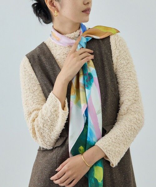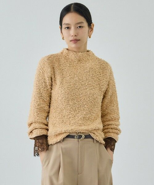 シンプルなシルエットながら、ファンシーヤーンの表情豊かな編地が個性を引き立てます。ヒップラインにかかる丈感はヒップの当たりをひろわず、ボトムスを選ばない一着。首周りを締め付けないハイネックで裾をアウトしてもバランスの良い着こなしを楽しめます。