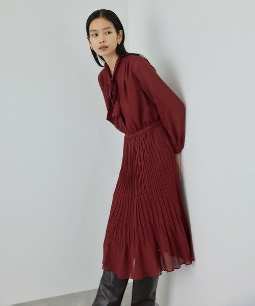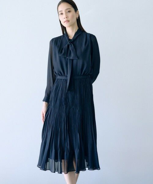 1枚で華やかに決まる、ボウタイ襟のランダムプリーツワンピース。身頃部分は透けないように裏地を付け、袖はやや透け感のある女性らしい、フェミニンな印象の1着です。