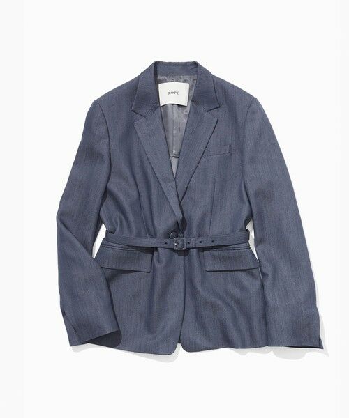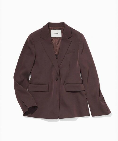 素材の柔らかさを生かした女性らしい印象のナロージャケット。低めの肩パッドで柔らかい印象を持たせ、ウエストボタンの位置をやや高めにすることでスタイルよく着用できます。さらにベルト付きで、ウエストマークするとモダンな印象に。同素材でブラウスとパンツも展開しています。