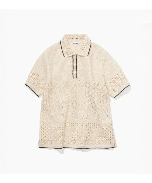 かぎ針で編んだような透かし柄が涼しげな印象を与える、ポロ衿デザインのニット。