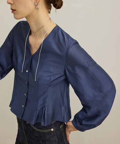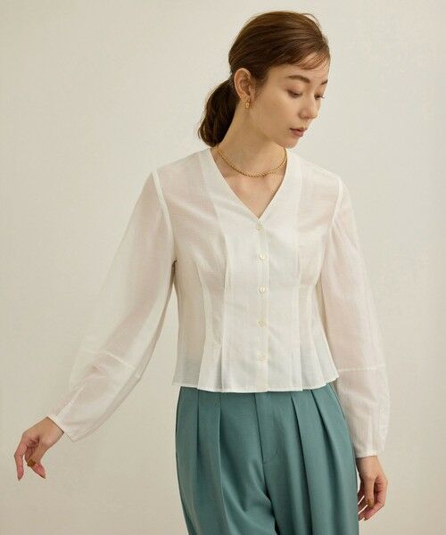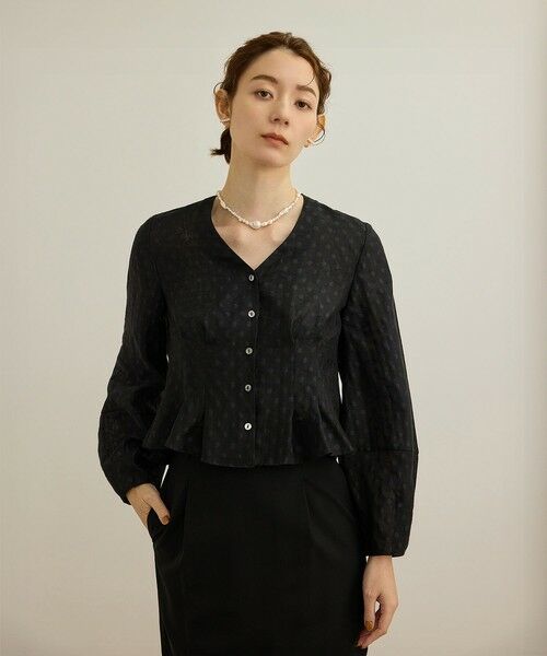 袖にボリュームをもたせ、ウエストシェイプしてペプラムになったシルエットがフェミニンな印象のデザインブラウスです。Vネック開きで顔周りをすっきり見せ、小顔効果もあります。