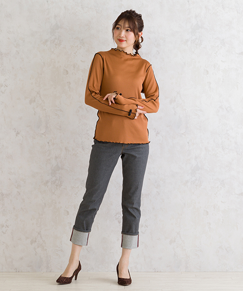 ゆったりとしたシルエットで、体に張り付かないのでインナー使いしやすいアイテムに。