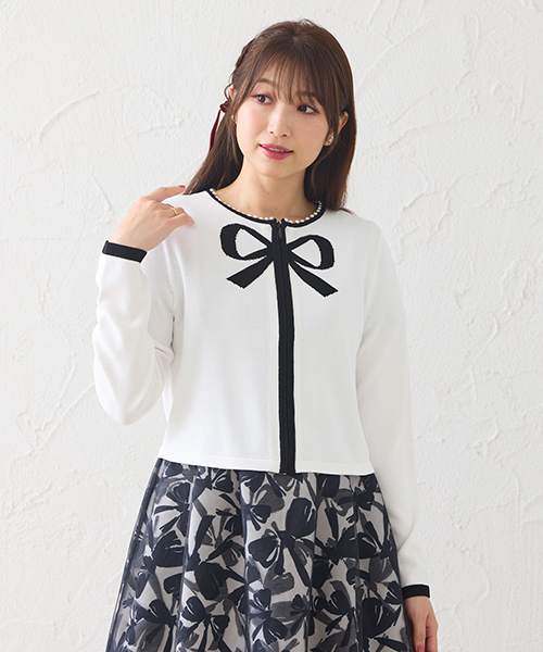 バイカラーリボンの配色がおとな可愛い、ニットカーディガン。