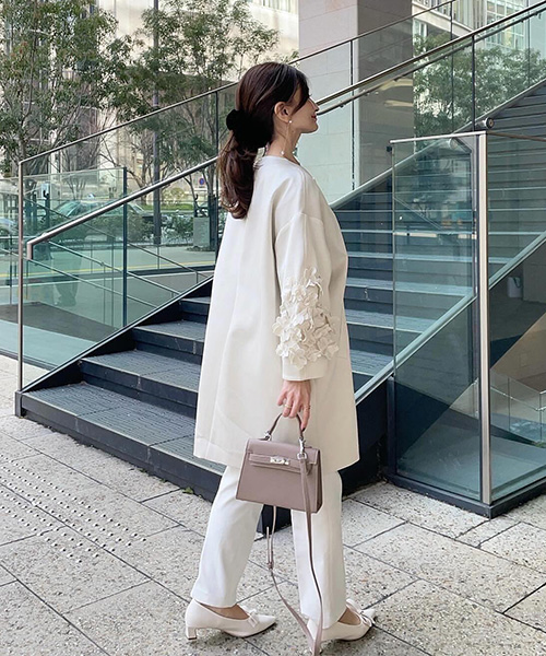 ・緩やかなコクーンシルエットにフラワーモチーフ付き袖が魅力。